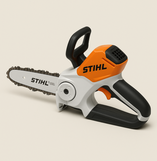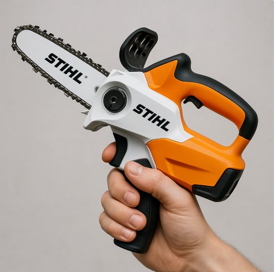 Obwohl das Gesamtdesign der mini kettensäge mit akku an eine einhändige Säbelsäge erinnert, empfiehlt STIHL ausdrücklich die Benutzung mit beiden Händen, um Verletzungsrisiken zu minimieren. Die ergonomische Griffform macht die Handhabung angenehm – eine Hand am Hauptgriff, die andere am oberen Griff zur Führung.